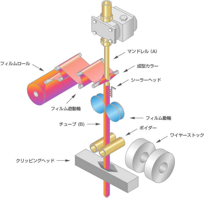 | チューブタイプ | 充填先にチューブの形態で納入され、手詰めチューブ状若しくはシャーリング形状により半自動充填結紮される。 |