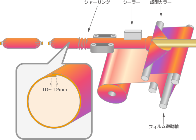 | 特徴 | 充填先にチューブの形態で納入され、手詰めチューブ状若しくはシャーリング形状により半自動充填結紮される。 | タテ型充填機またはヨコ型自動充填機で、フラットフィルムをチューブ状に製袋しながら充填、結紮される。 |