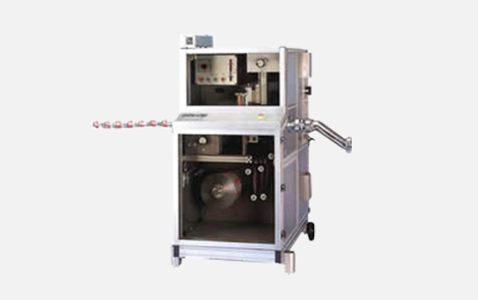 シール方式は、ヒートシール方式で、フラットフィルムをチューブ状にシールした後、ノズルから内容物を押し出し充填ケッサツする方式です。